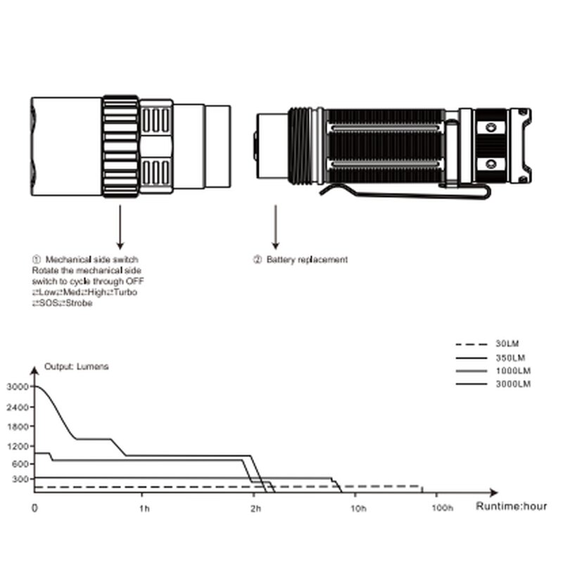 Ausgestattet mit einer Luminus SFT70 LED, bietet diese Taschenlampe eine Leistung von maximal 3.000 Lumen und einer maximale Reichweite von 500 Metern.