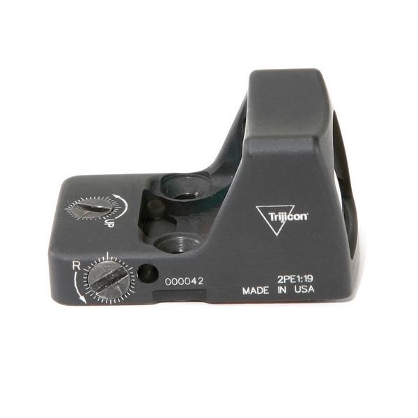 RMR Absehen Dot 3.25MOA rot beleuchtet mit Batterie 3V1xCR2032 Ruggedized Miniature Reflex, Größe LxWxH 1,8x1,1x1,0"/46x28x25mm, Gewicht 1,2oz/34gramm mit Batterie, extra gehärtetem Aluminium Gehäuse schwarz matt, Linse aus gehärtetem Glas wurde sehr sorgfältig verarbeitet, ist widerstandfähig und schußfest, parallaxe frei, Code RM01 Trijicon USA.