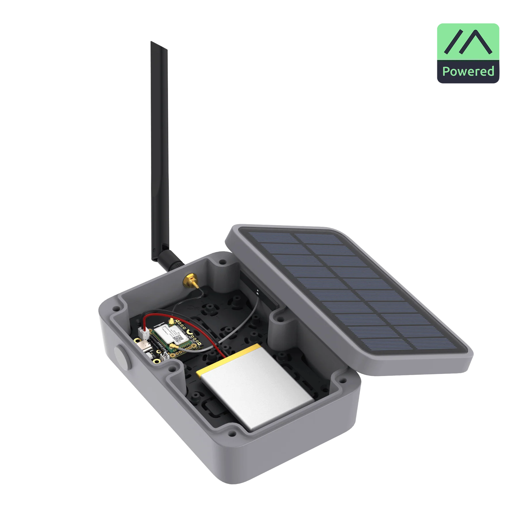 - IP67-rated, 150 mm x 100 mm x 45 mm enclosure with pre-mounted M8 5-pin connector, RP-SMA antenna connector, and solar panel