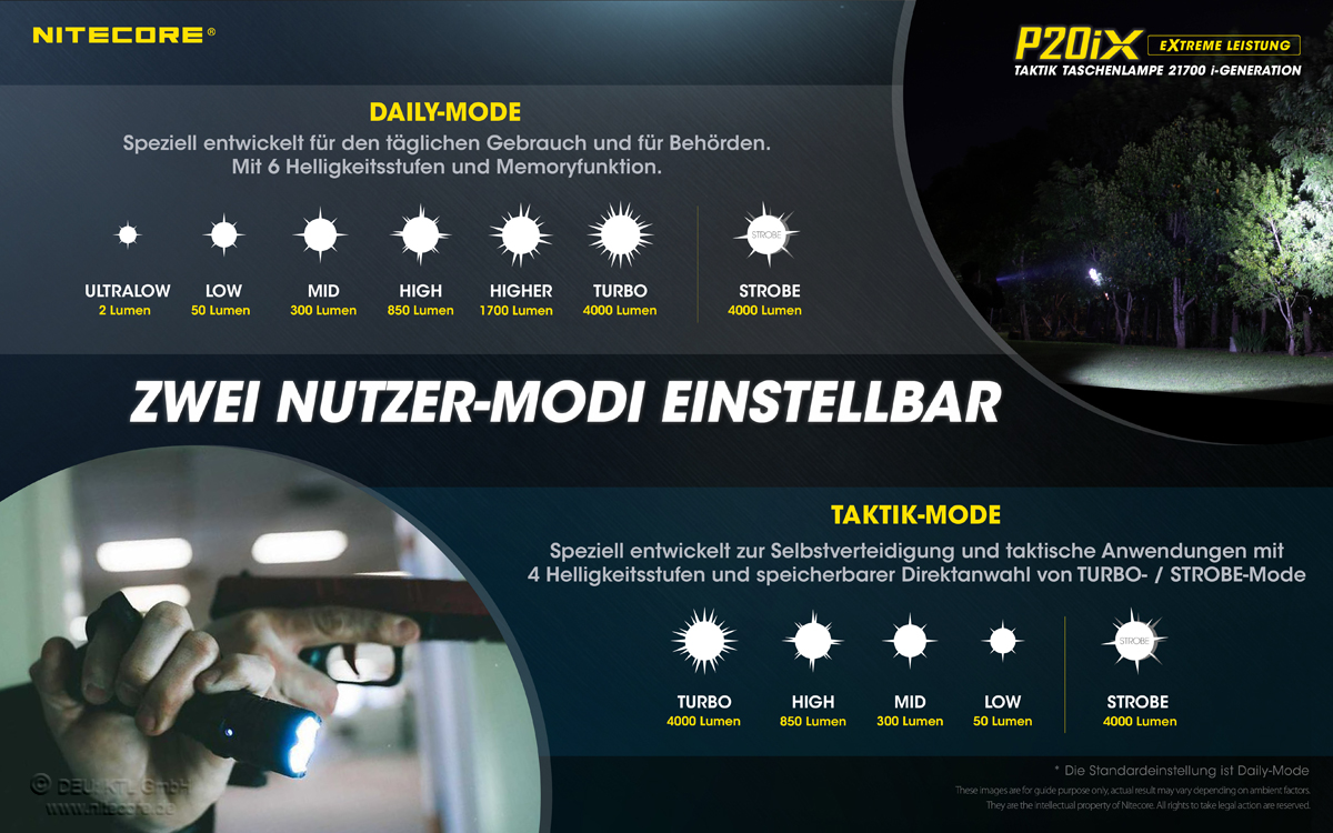 Als Energiequelle dient der P20iX ein NL2150HPi Li-Ion Akku mit 5000mAh Kapazität, dies sorgt für eine lange Brenndauer. Der überarbeitete STROBE READY Button ermöglicht ein schnelles Umschalten