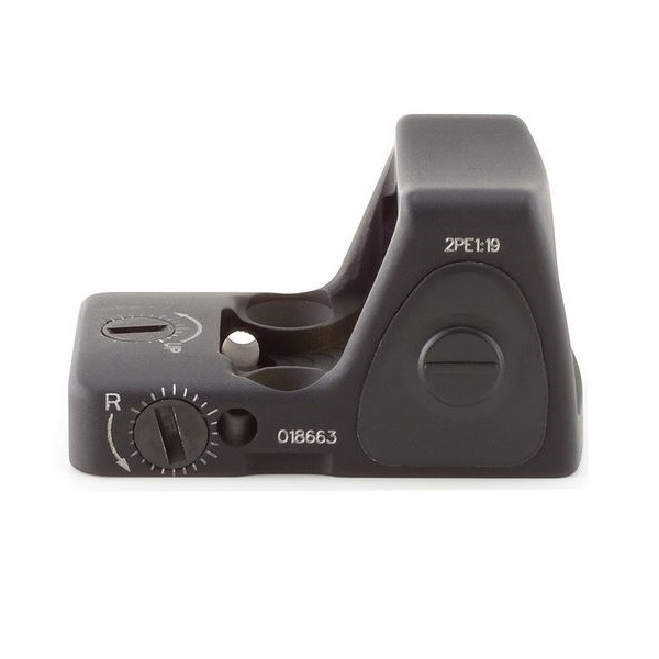 RMR-Ruggedized Miniature Reflex Absehen Dot 3.25MOA rot beleuchtet Type2, ADJ-verstellbar in 8/acht Helligkeitsstufen mittels seitlichen Plus- und Minustasten, 1/eine Batterie 3V1xCR2032 ist erforderlich, Größe Länge 1,8"/45,72mm x Breite 1,1"/27,94mm x Höhe 1"/25,4mm, Gesamtgewicht 1,2oz/34,02gramm mit Batterie, extra gehärtetem Aluminium Gehäuse schwarz matt, Linse aus gehärtetem Glas die sehr sorgfältig verarbeitet wurde, widerstandfähig, schußfest und parallaxe frei, inclusive Befestigungsschrauben, Code RM06-C-700672 Trijicon USA.